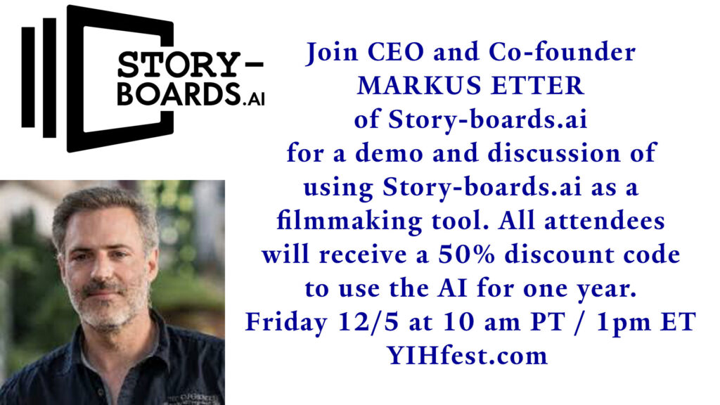 10 am PT / 1 pm ET: Join Story-boards.ai CEO Markus Etter and Festival Director Quentin Lee for a livestream demo and discussion of using Story-boards.ai for filmmaking on Thursday Dec 4 at 10 am PT / 1 pm ET. Attendees will be offered a 50% discount code to use Story-boards.ai for a year. Join the panel: https://us02web.zoom.us/webinar/register/WN_VpB4mOlHTL2JbhEqxPnfSA