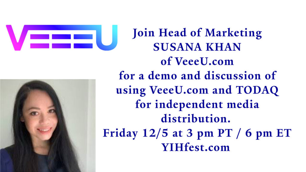 3 pm PT: / 6 pm ET: Join VeeeU CMO Susana Khan and Festival Director Quentin Lee for a livestream demo and discussion of using VeeU.com and TodaQ, a new TVOD streaming platform and micropayment service, for independent media distribution. Join the panel: https://us02web.zoom.us/webinar/register/WN_McreVpL9TL-uK88MQGtxkw